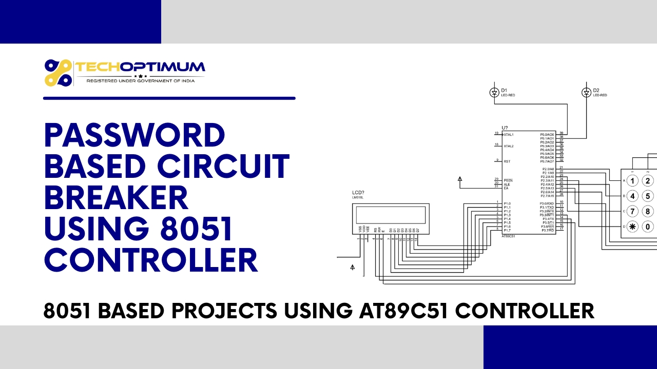 Learn about Password Based Circuit Breaker using 8051 microcontroller and keypad with LCD, relay, and LED. Get source code, circuit diagram & project support from Tech Optimum.